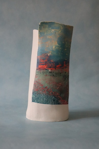 2025Deze vaas is gemaakt van twee plakken uitgerolde porseleinklei. Op één plak is een monoprint aangebracht met groene, gele en oranje kleislibs. De binnenkant is geglazuurd met transparante hoogglans glazuur en daardoor waterdicht. Electrisch gestookt op 1260 ºC.